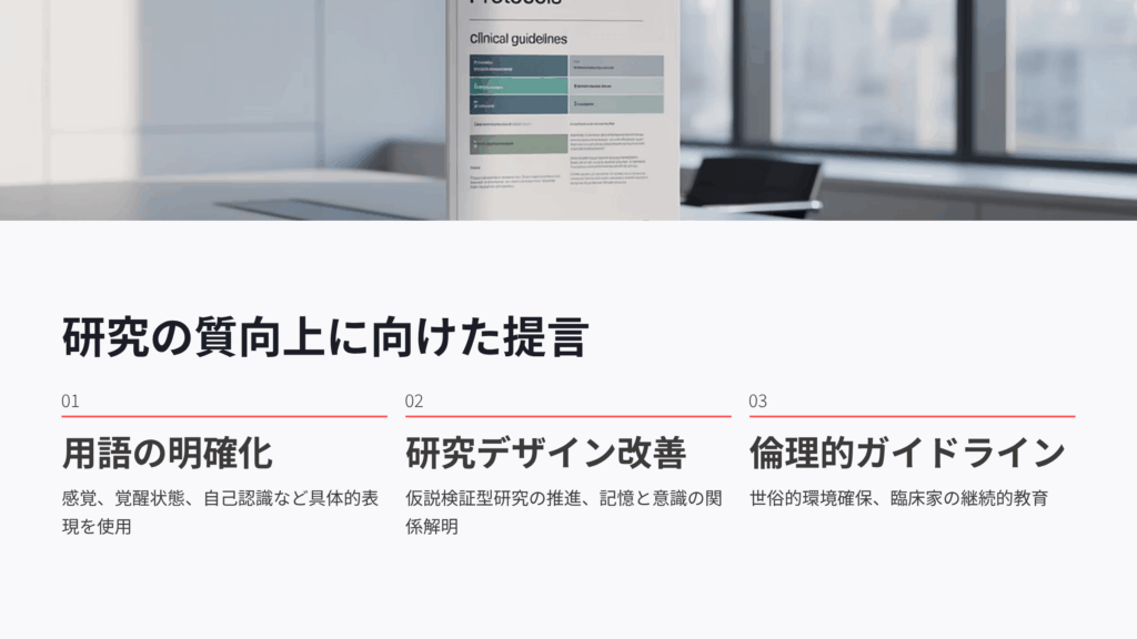 論文では、科学的な正確性を保つために、研究者は「意識」という曖昧な用語の使用を避け、より具体的で明確に定義された用語を使用すべきとしています。例えば、「主観的体験の変化」「自己参照的処理の変化」「感覚認知の変化」といった具体的な表現が推奨されています。