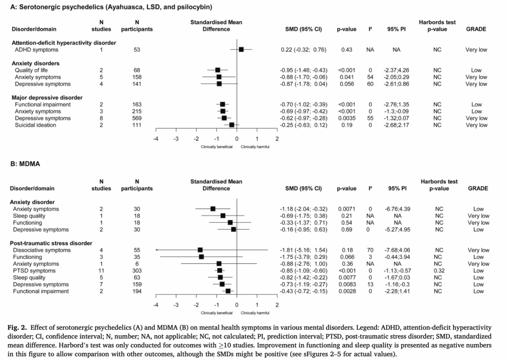 Højlund, M., Kafali, H. Y., Kırmızı, B., Fusar-Poli, P., Correll, C. U., Cortese, S., Sabé, M., Fiedorowicz, J., Saraf, G., Zein, J., Berk, M., Husain, M. I., Rosenblat, J. D., Rubaiyat, R., Corace, K., Wong, S., Hatcher, S., Kaluzienski, M., Yatham, L. N., … Solmi, M. (2025). Efficacy, all-cause discontinuation, and safety of serotonergic psychedelics and MDMA to treat mental disorders: A living systematic review with meta-analysis. European Neuropsychopharmacology, 101, 41–55. https://doi.org/10.1016/j.euroneuro.2025.09.011