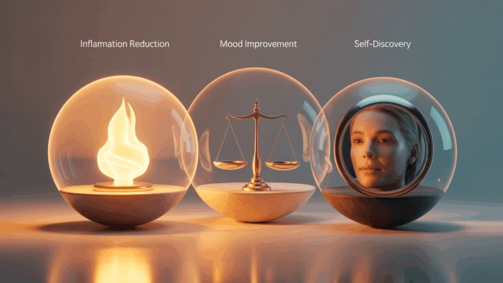 シロシビンセッションでは、脳内の異なる領域間のつながりが増加し、普段は抑制されている自己認識にアクセスできることがあります。ある実践者は、セッション中に「3時間、本当の自分と過ごすことができた」という体験を報告しています。このような体験が、更年期という人生の転換点において、新たな自己像を構築する助けとなるのです。
