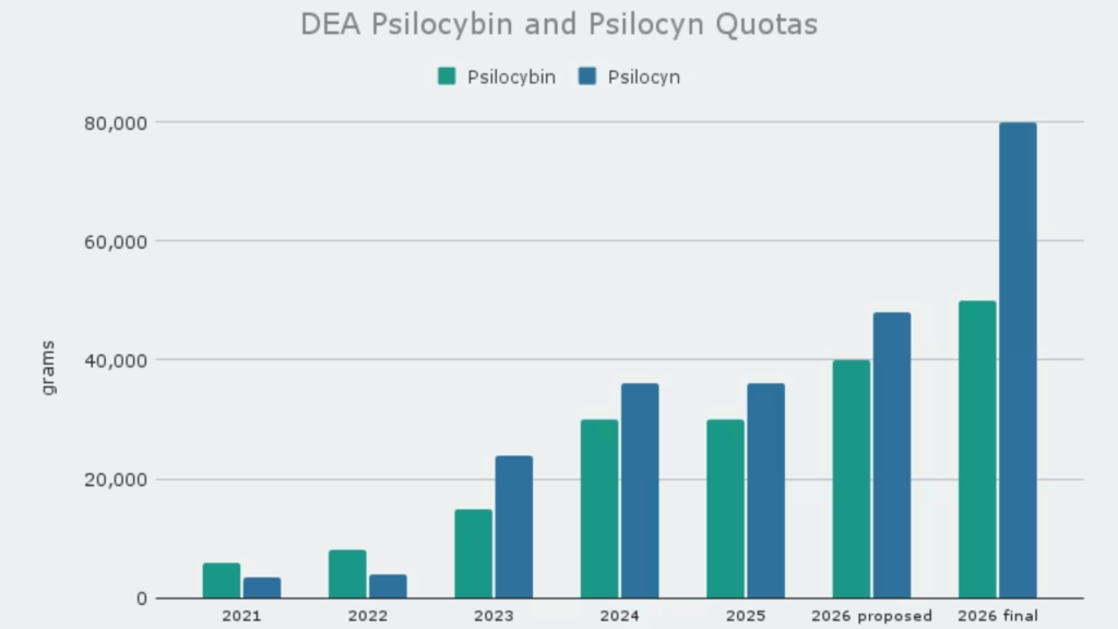 Jaeger, K. (2026, January 5). DEA boosts legal production levels for psychedelics like psilocybin and DMT in final rule for 2026. Marijuana Moment. https://www.marijuanamoment.net/dea-boosts-legal-production-levels-for-psychedelics-like-psilocybin-and-dmt-in-final-rule-for-2026/