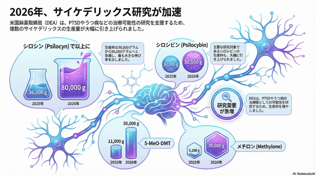具体的な数値を見ると、その変化の大きさがよくわかります。シロシビンの生産割当量は2025年の30,000グラムから2026年には50,000グラムへと約67%増加しました。さらに驚くべきことに、シロシンについては36,000グラムから80,000グラムへと2倍以上に拡大されています。