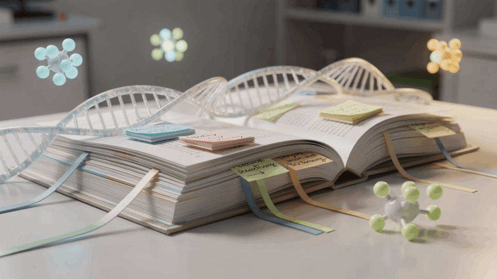 エピジェネティクスの概念を理解するために、わかりやすいたとえを使いましょう。私たちのDNAが「料理のレシピ本」だとすれば、エピジェネティクスは「どのページを開いて、どのレシピを実際に作るか」を決める付箋やしおりのようなものです。レシピ本そのもの(DNAの配列)は変わりません。しかし、付箋の貼り方が変われば、実際に作られる料理(タンパク質)の種類や量が変わります。つまり、同じDNAを持っていても、環境や経験によって遺伝子の「使われ方」が変わりうるのです。