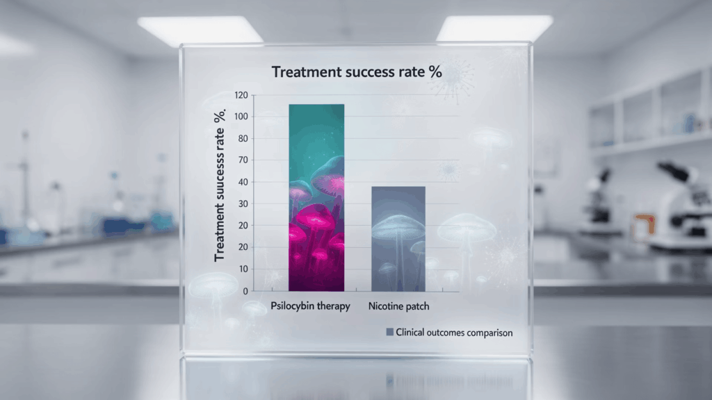 最新の研究において、シロシビンを用いたサイケデリック療法は、従来の禁煙治療であるニコチンパッチと比較して、6か月後の持続的な禁煙成功率において6倍以上の効果を示しました。