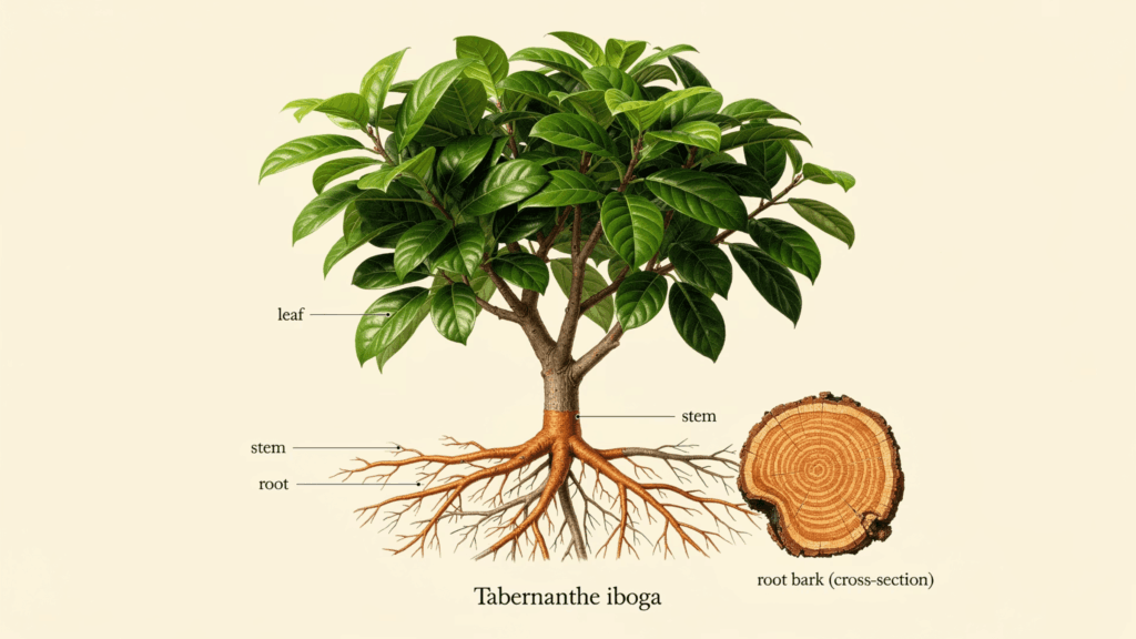 イボガインは、中央アフリカの熱帯雨林に自生するキョウチクトウ科の低木「タベルナンテ・イボガ」(Tabernanthe iboga)の根皮に含まれるインドールアルカロイドです。「アルカロイド」とは植物が作り出す窒素を含む天然化合物の総称で、カフェインやモルヒネもこの仲間に含まれます。イボガインはその中でも、複数の神経伝達物質系——オピオイド受容体、セロトニン受容体、NMDA受容体、シグマ受容体など——に同時に作用するという、きわめてユニークな薬理プロファイルを持っています。