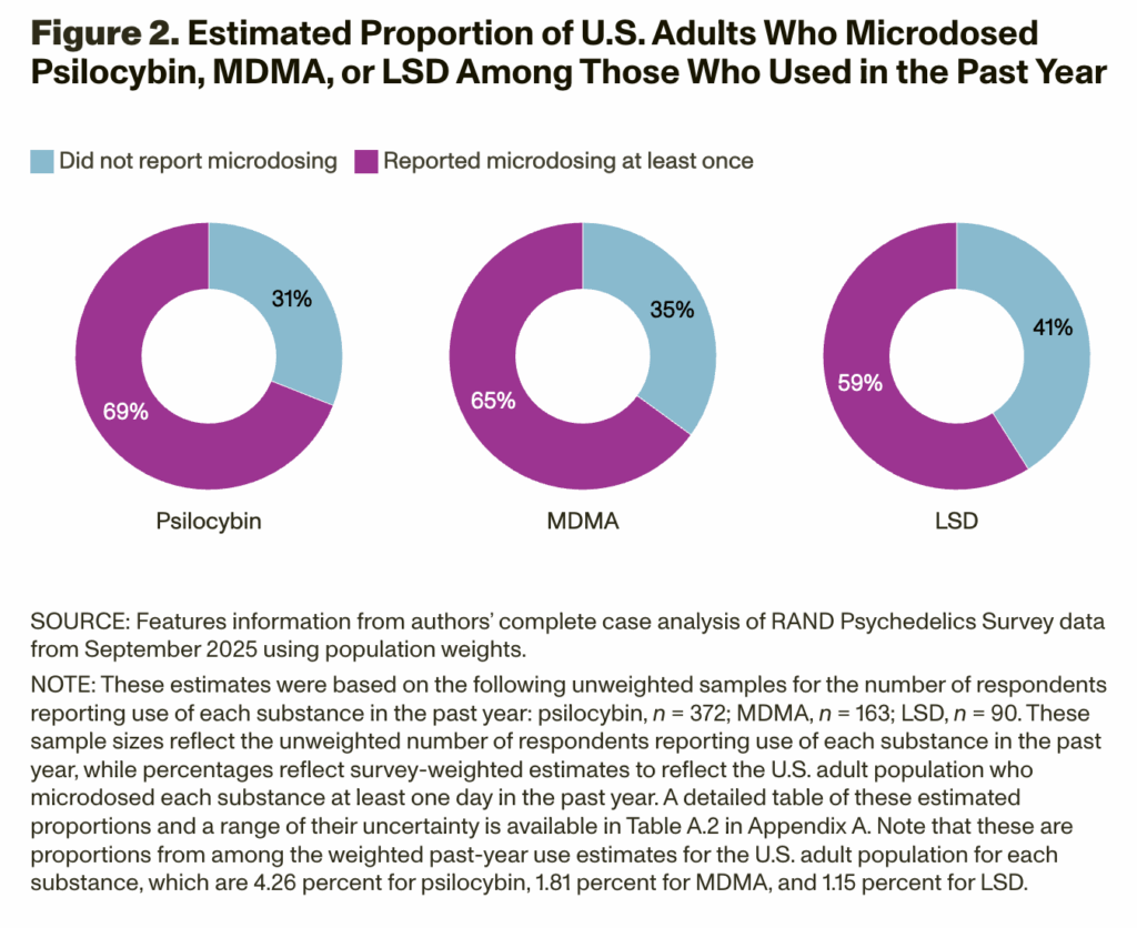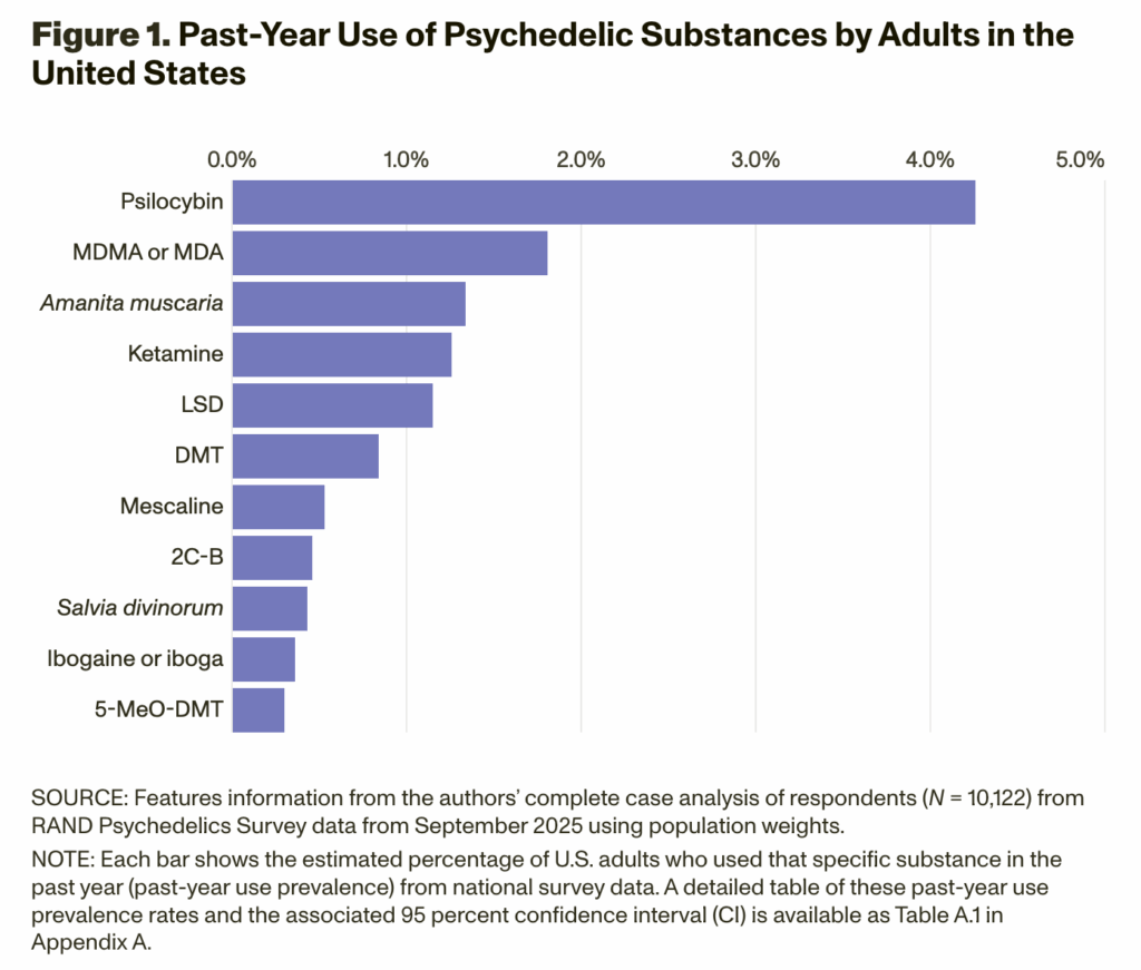 Priest, M., Kilmer, B., Senator, B., & Setodji, C. M. (2026). U.S. psychedelic use and microdosing in 2025: Insights from a probability-based and nationally representative survey (RR-A4334-1). RAND Corporation. https://www.rand.org/pubs/research_reports/RRA4334-1.html